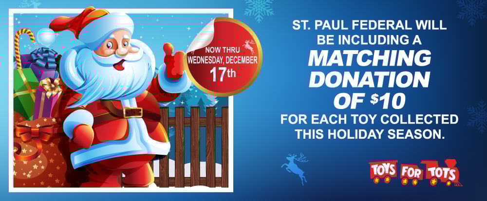 To add even more joy to the toy drive, St. Paul Federal will donate an additional $10* for every toy collected at our branches through the holiday season!